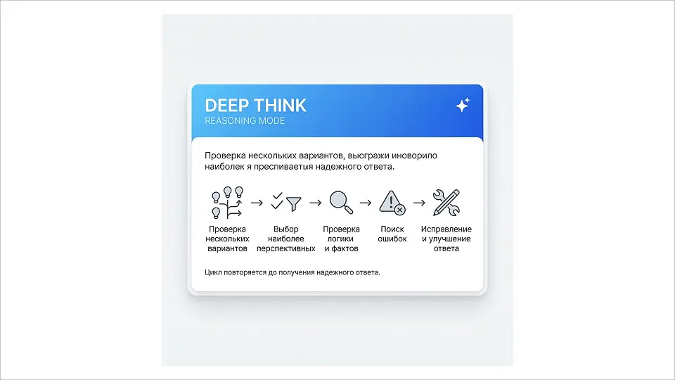Google решила эту проблему радикально: в Gemini 3 появился режим Deep Think, который рассматривает несколько путей решения одновременно, отбрасывает тупиковые ветки и выбирает самый убедительный вариант.