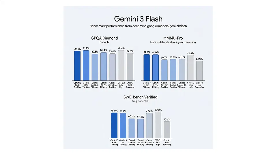 А вот бенчмарки удивили многих. Flash показывает 90.4% на GPQA Diamond (сложные вопросы уровня экспертных знаний), 81.2% на MMMU Pro (мультимодальные задачи) и около 78% на SWE-bench по программированию.